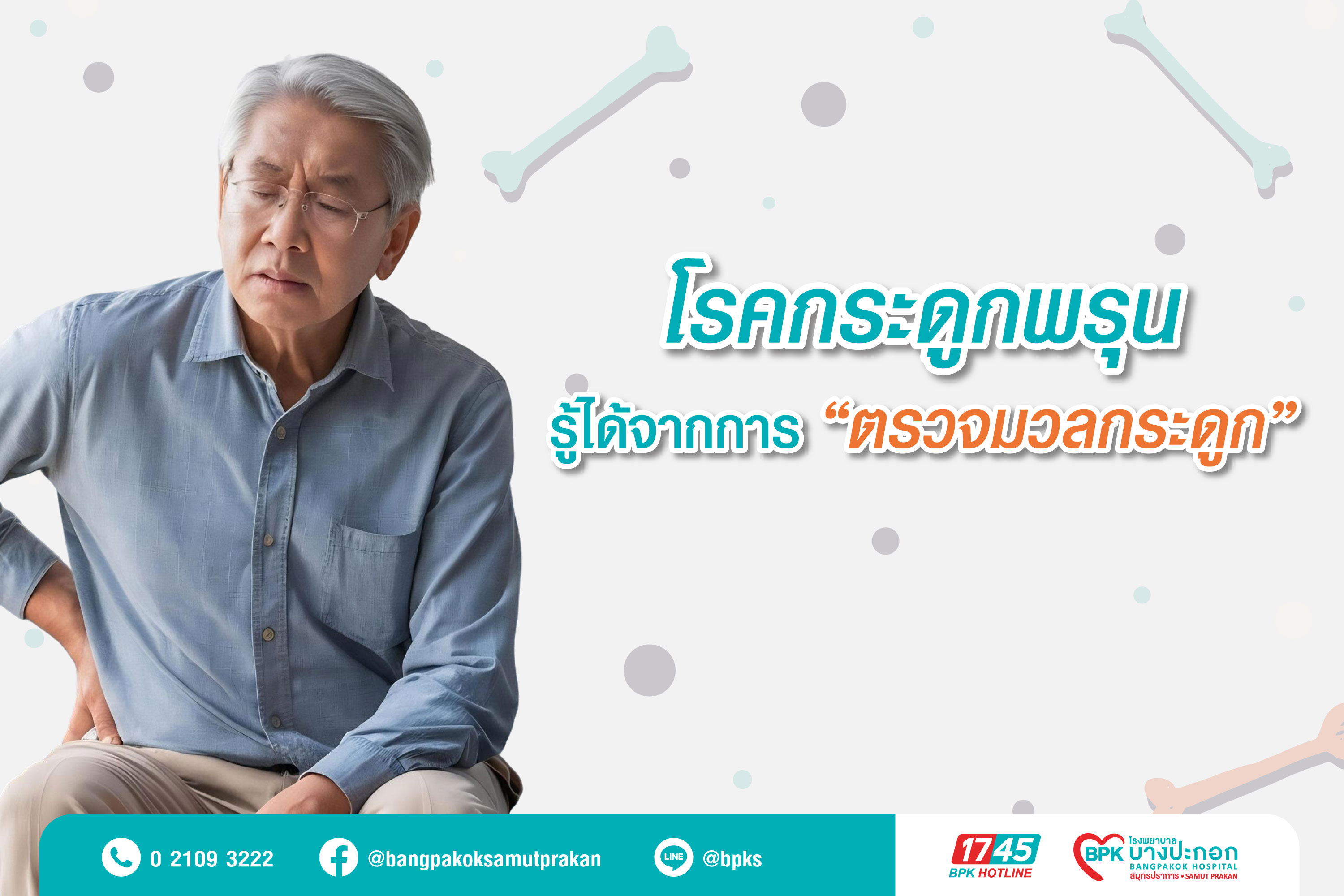 โรคกระดูกพรุนเป็น ภัยเงียบที่แฝงอยู่ในร่างกาย เพราะแทบไม่มีสัญญาณเตือนใดๆ เลยในระยะเริ่มต้น ทำให้หลายคนไม่รู้ตัวว่ากระดูกกำลังบางลงเรื่อยๆ จนกระทั่งเกิด “กระดูกหัก” จึงพบโรคเป็นครั้งแรก โดยเฉพาะเมื่อเกิดการหักบริเวณ กระดูกสันหลัง ผู้ป่วยมักมีอาการปวดหลังอย่างรุนแรง เดินหลังงอ ตัวเตี้ยลง หรือหลังโก่งจนสังเกตได้ชัดเจน ซึ่งส่งผลต่อการใช้ชีวิตประจำวัน คุณภาพชีวิต และความสามารถในการเคลื่อนไหวอย่างมาก